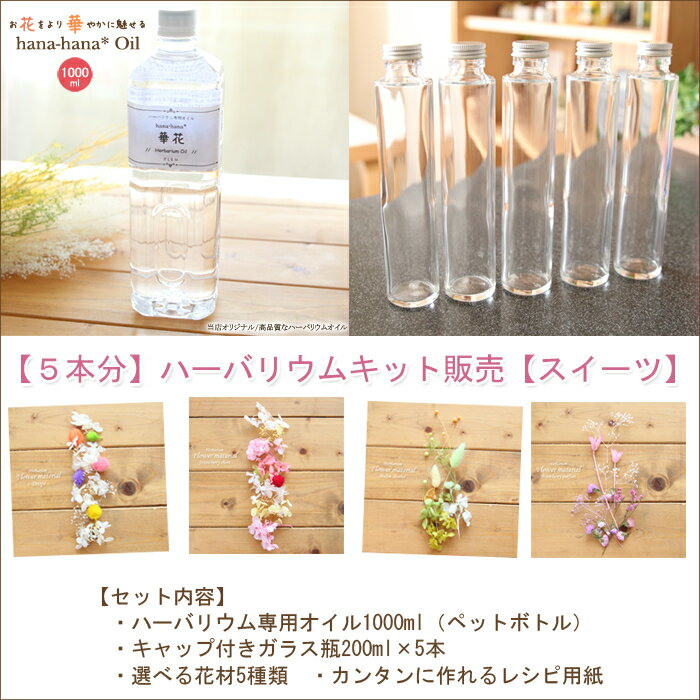 【5本分】【スイーツ】ハーバリウム 手作り キット(オイル1本、ガラス瓶5本、花材セット5種類) 植物標本 結婚 スターターキット 初心者 誕生日プレゼント 花材 ギフト ケーキ イチゴ お菓子 子供 夏休み 工作 宿題 カフェ 母の日
