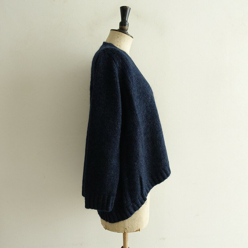 カラーはネイビー×グリーン×パープルなどのミックス(ブランド表記はブルー)で、モヘヤなど混紡の毛羽感あるニット地です。