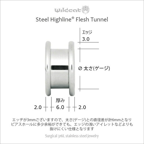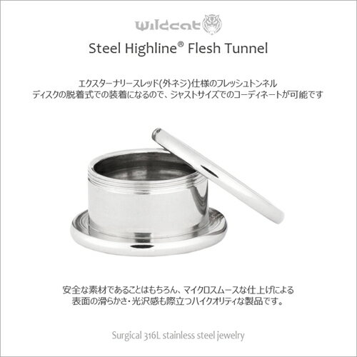 ■商品説明 *商品名:Steel Highline® Flesh Tunnel *ブランド:WILDCAT COLLECTION *素材:316Lサージカルステンレス *サイズ(太さ):22mm/24mm/26mm/28mm/30mm エクスターナリースレッド(外ネジ)タイプのディスク脱着仕様なので、ピアスホールに負担なく装着ができ、ジャストサイズでのコーディネートが可能です。