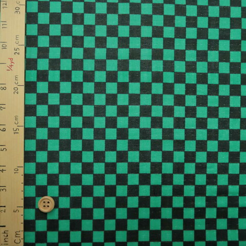 マスク・じんべいにアニメのコスプレに人気!黒と緑の市松柄がダブルガーゼ生地で登場!格子ひとつ分の大きさは約1.4cm角、「コットン生地 市松柄1.4cm角」と同じ色柄です。