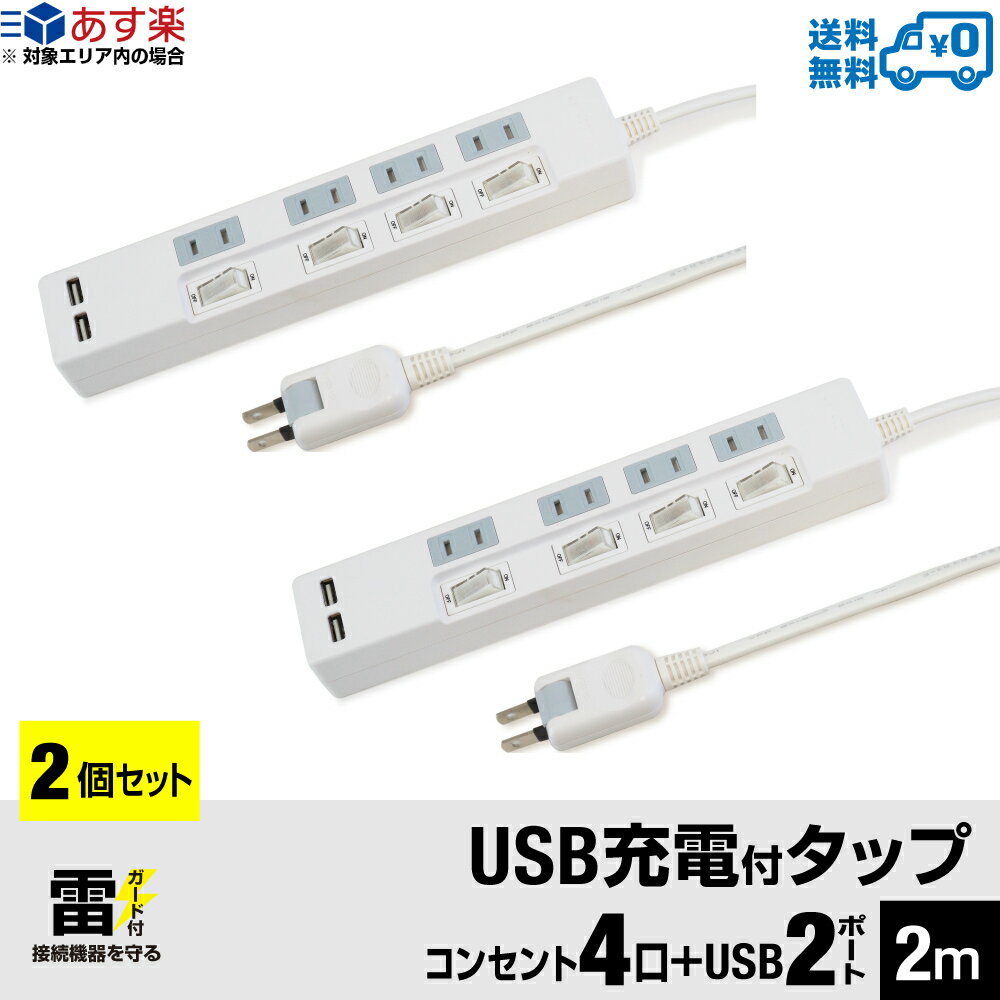 【あす楽対応・2個セット・1個当たり1,799円】送料無料 USB充電ポート付 電源タップ 2ポート合計2.4A出力・ACコンセント 4口 2m 18ヵ月保証 テレワーク タコ足 コンセントタップ USBタップ 延長コード 雷ガード