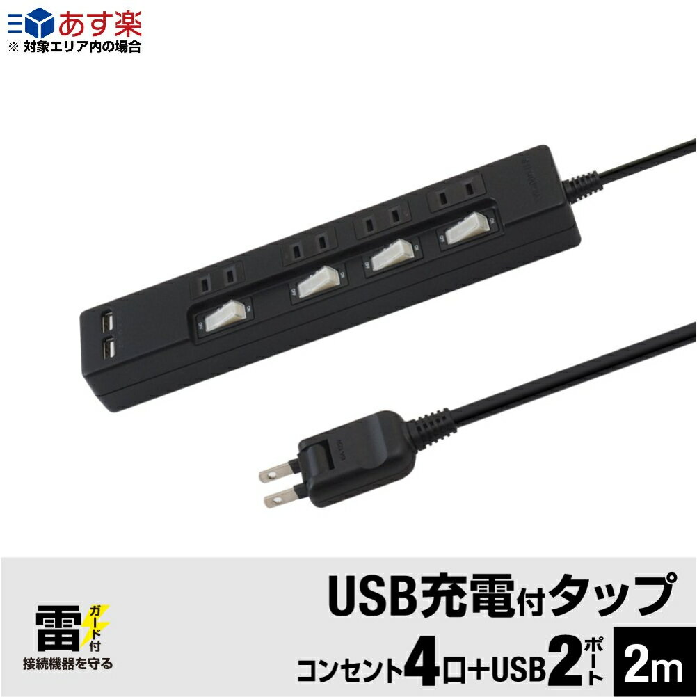 【あす楽対応・送料無料】雷ガード USB充電ポート付 電源タップ 2ポート合計2.4A出力・コンセント 4口 2m 18ヵ月保証 テレワーク タコ足 スマホ タブレット コンセントタップ USBタップ 延長コード プレミアムブラック STP4UA2B-2 STYLED スタイルド