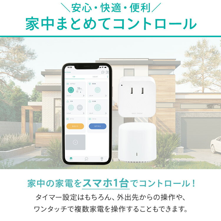 “外出先からでも操作ができる、スマート家電リモコン&プラグセット”◆ 安心・快適・便利、家中まとめてコントロール家中の家電をスマホ1台でコントロール!タイマー設定はもちろん、外出先からの操作や、ワンタッチで複数家電を操作することもできます。